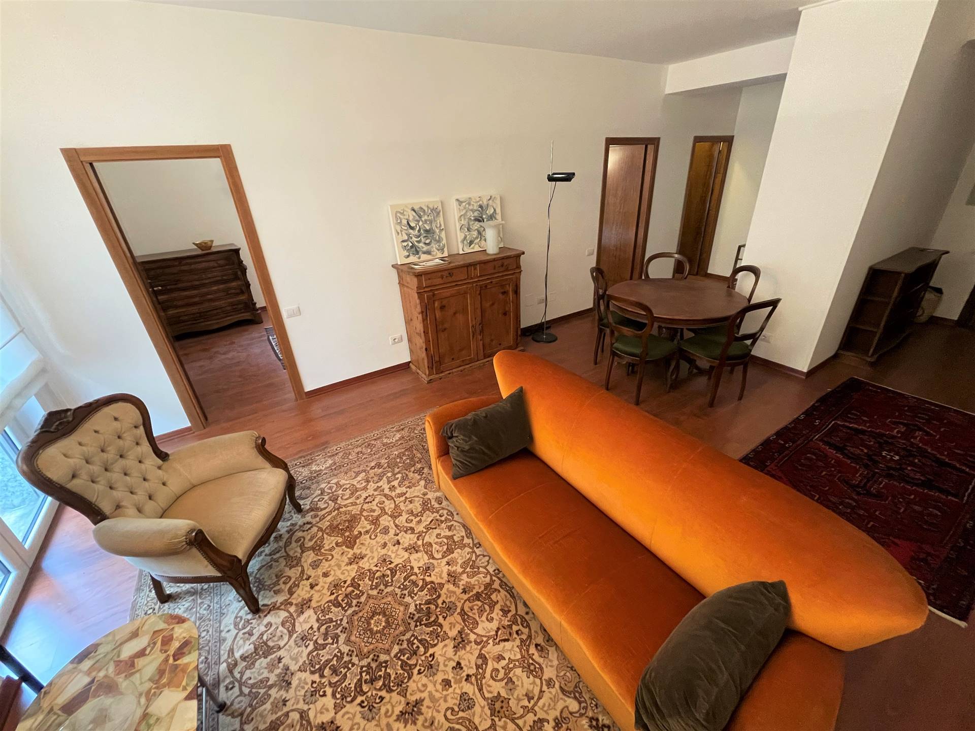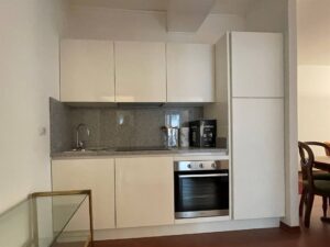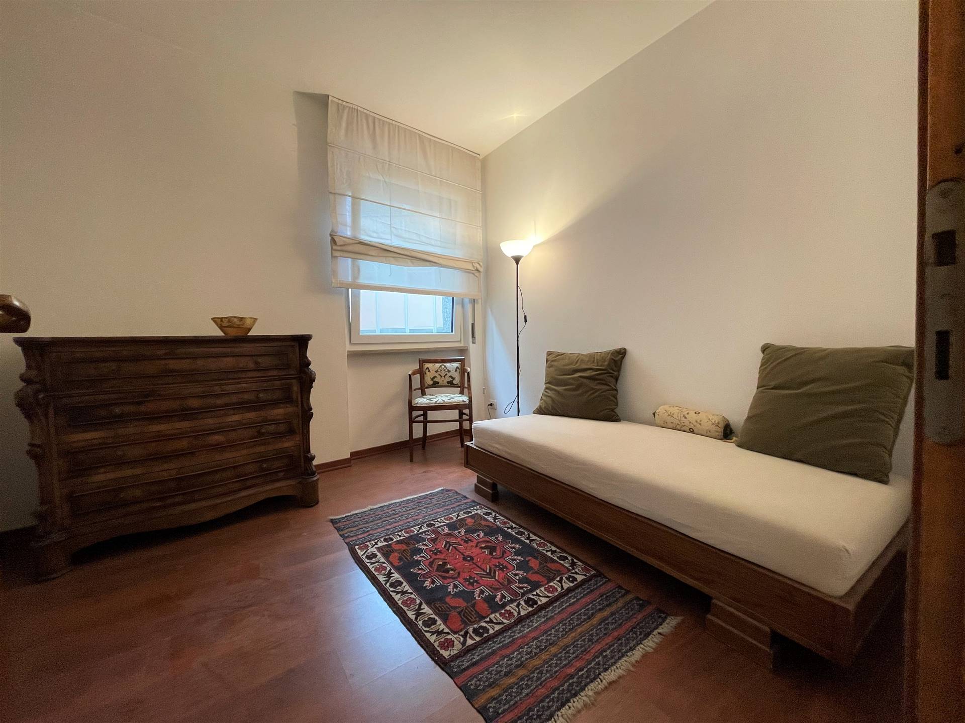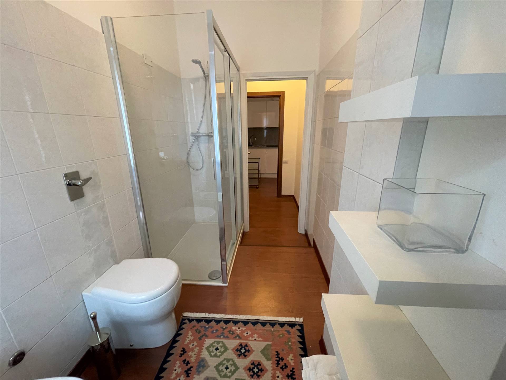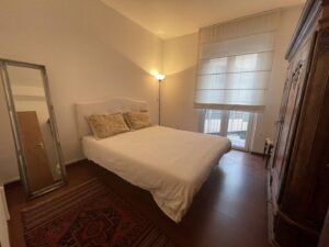 The apartment consists of a living room with kitchenette, 2 bedrooms, bathroom and 2 balconies. The entrance leads to the spacious living area with a balcony overlooking the streets of the historic centre. The kitchenette is linear, well organised and equipped with a dishwasher and induction hob. The master bedroom has access to the second balcony, while the second room can be used as a bedroom or study/library. The bathroom with shower is preceded by a convenient dressing room.