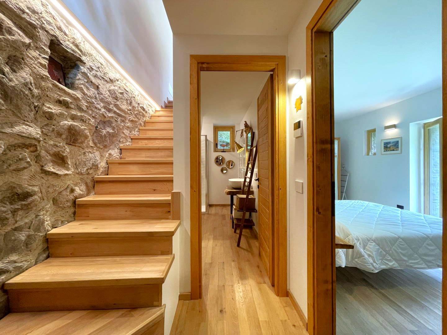 First floor: independent entrance through private terrace/garden leading to a cosy living room with open kitchen, fully equipped and featuring a wood stove, ideal for creating a warm and cosy atmosphere. The living room leads to the panoramic mezzanine via a charming wooden staircase: a versatile room, perfect as a relaxation area or as a second bedroom with two beds.