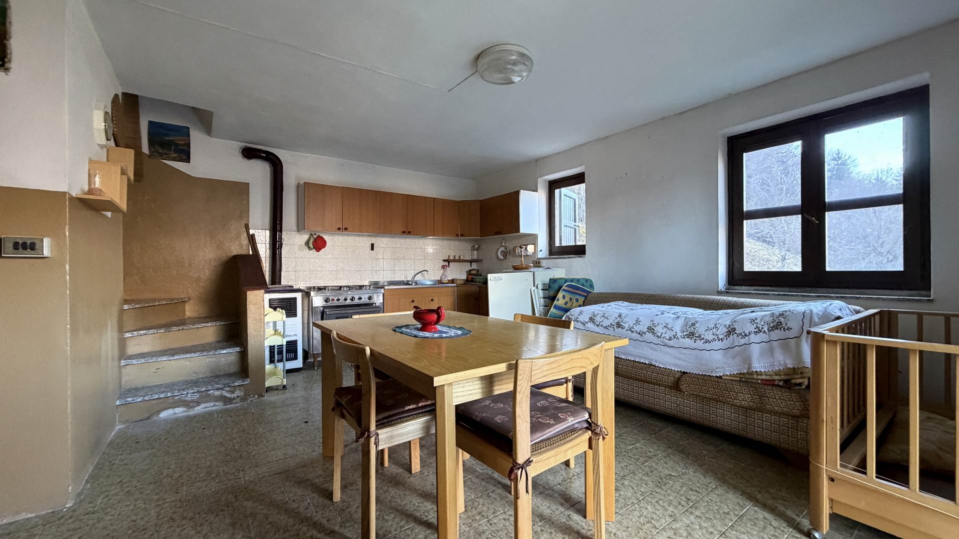 Heating is provided by a stove and fireplace, ideal solutions for creating a warm and convivial atmosphere in every season.The property is completed by a large exclusive plot of land measuring approximately 3,457 square metres (1,417 square metres + 2,040 square metres), perfect for relaxing in the open air, outdoor activities or for those who love to experience the mountains in an authentic way.