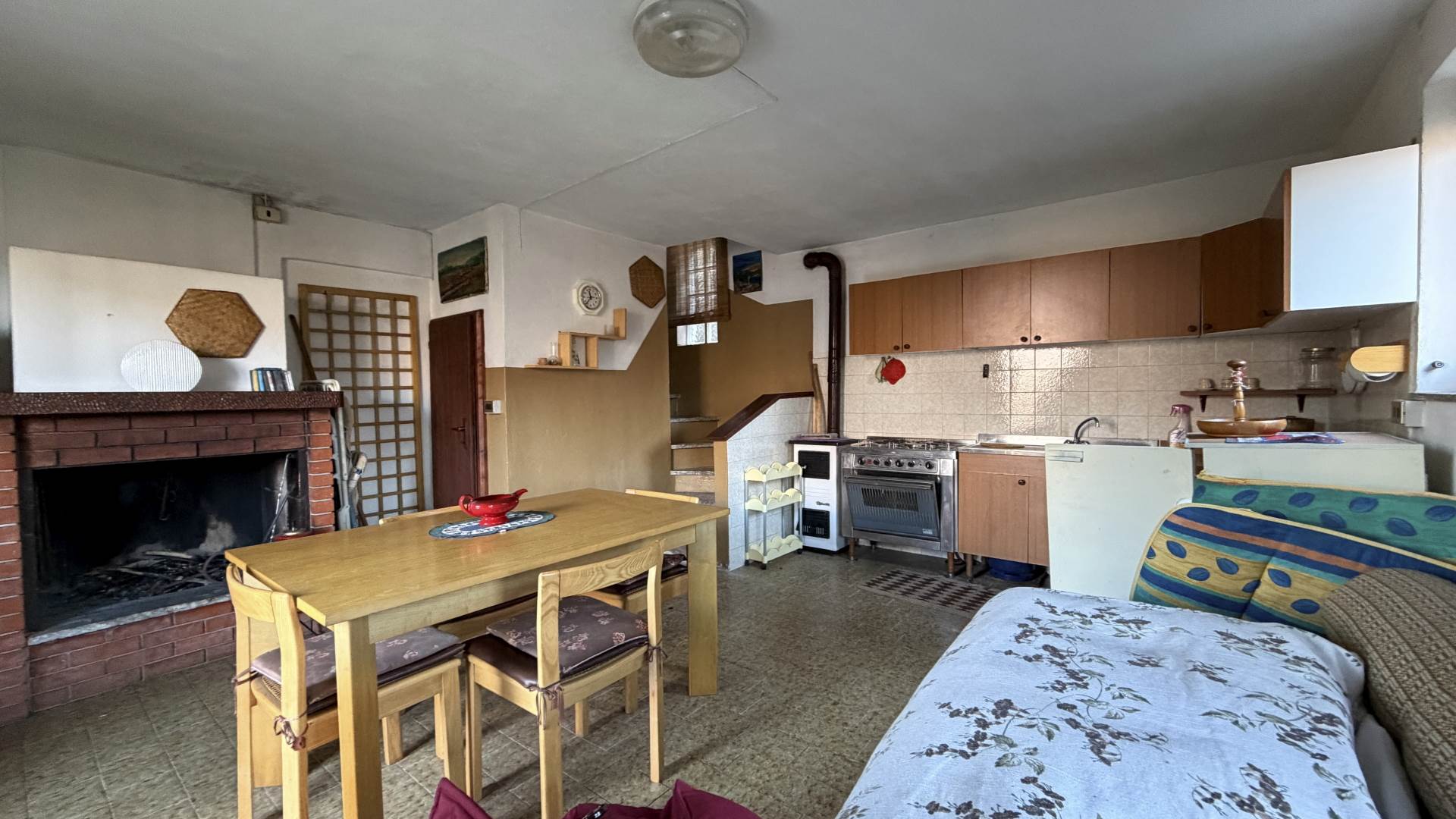 • Ground floor: living room with sofa, dining table and fireplace, fully equipped kitchen.