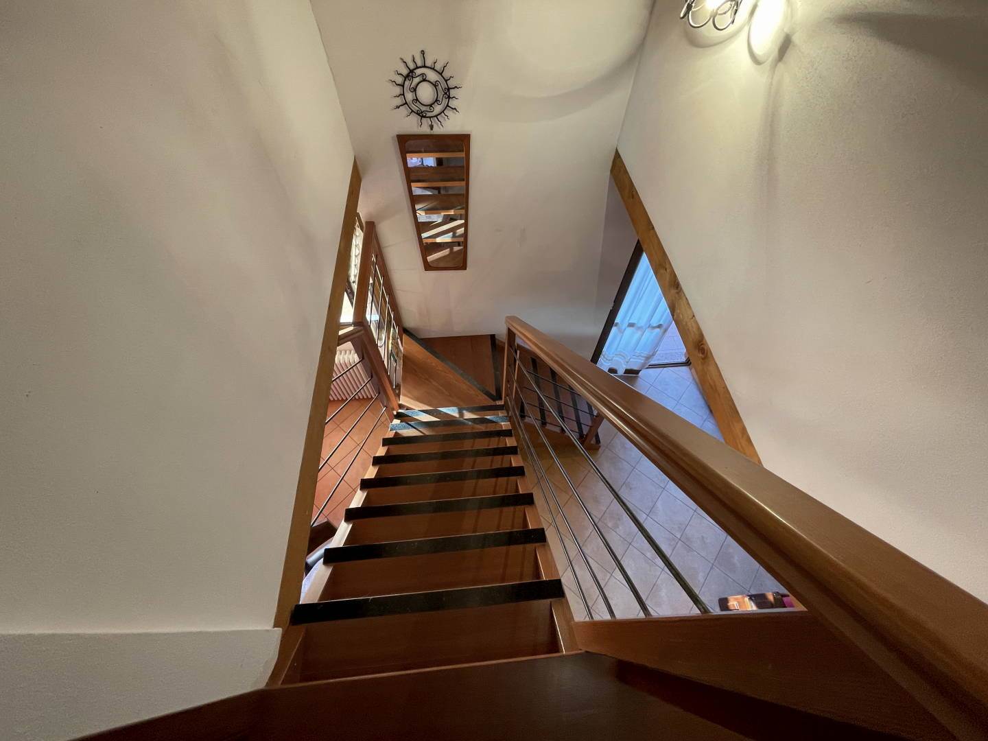 On the ground floor, there is a cosy living room with dining area, fully equipped kitchen, relaxation area with armchairs, a large sunny terrace, perfect for outdoor moments and a bathroom.