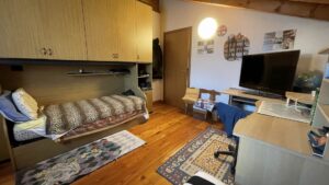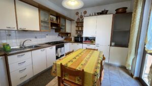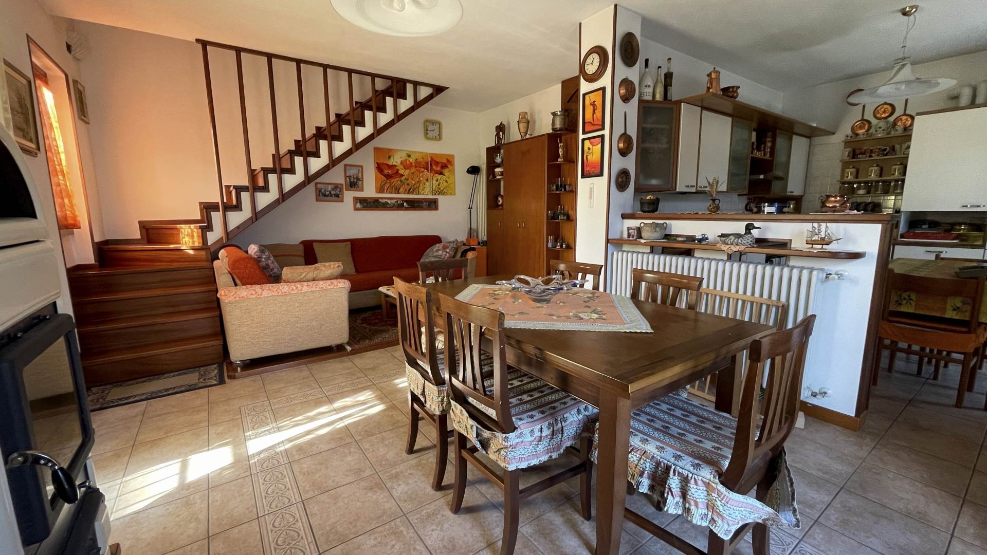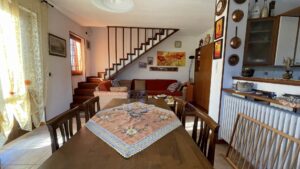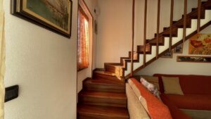 Al piano primo si sviluppa la zona giorno, composta da un accogliente soggiorno arredato con divano, tavolo da pranzo e stufa a legna, cucina attrezzata, bagno di servizio e tre balconi che garantiscono luminosità e sfogo esterno. Una scala interna collega il piano superiore.