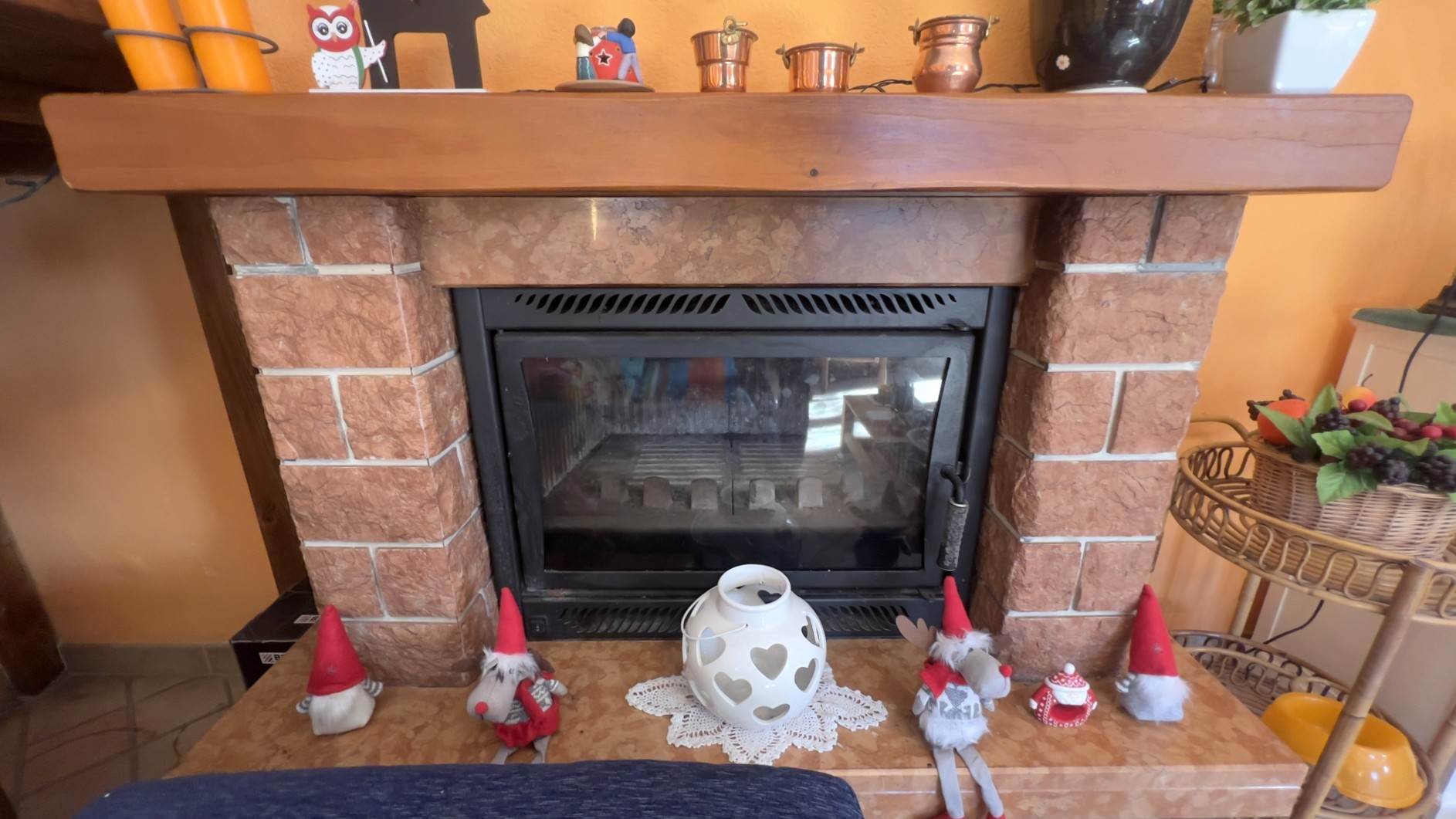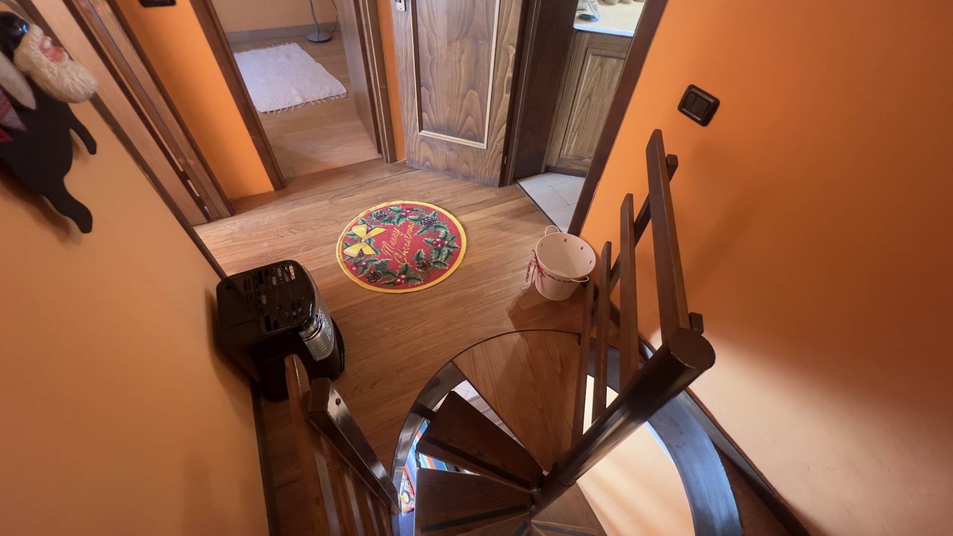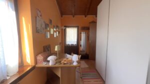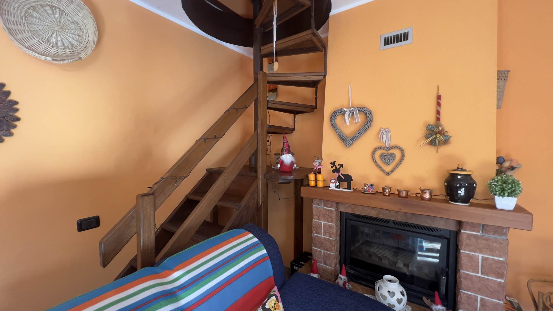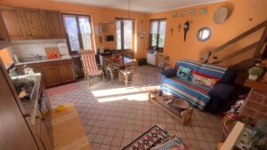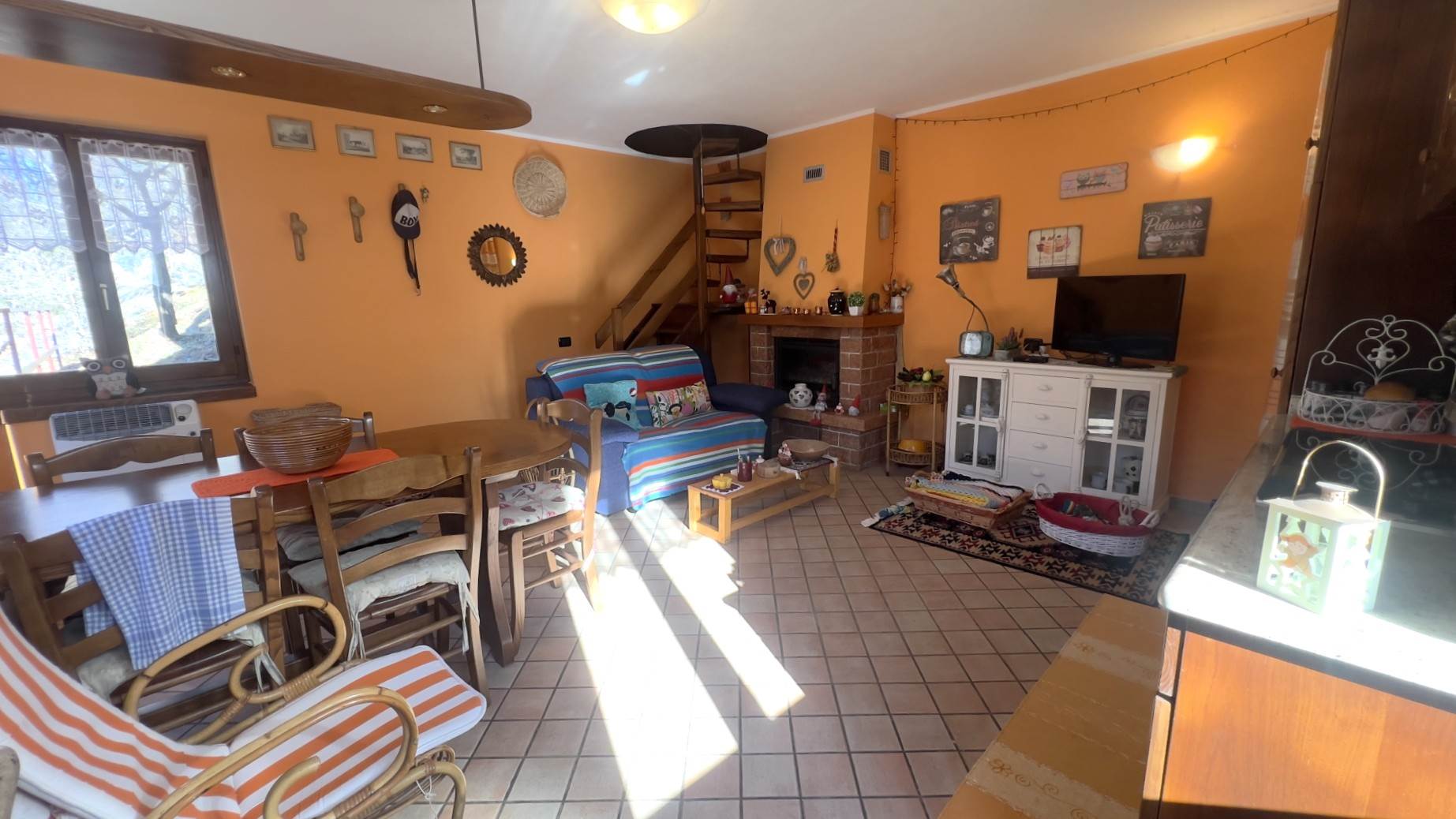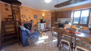 • Piano terra: cucina e soggiorno in ambiente unico, dotato di camino ventilato, divano e tavolo da pranzo. Il collegamento al piano superiore avviene tramite scala a chiocciola.