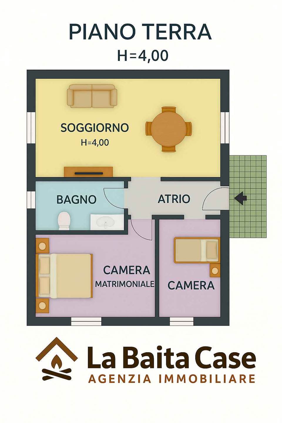 Entrando, si viene accolti da un disimpegno che introduce nella zona giorno, un ambiente ampio e luminoso dove il caminetto diventa protagonista, diffondendo un’atmosfera intima e raccolta. Lo spazio è organizzato in modo funzionale, con un angolo cottura ben attrezzato e una zona pranzo perfetta per condividere momenti conviviali con famiglia e amici. Le due camere matrimoniali sono accoglienti e confortevoli mentre il bagno è dotato di doccia.