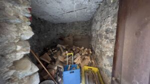 Il riscaldamento è garantito da stufa e camino a legna, rendendo l'abitazione calda e accogliente durante la stagione invernale. Nel sottoscala è posizionata la bombola del gas.
