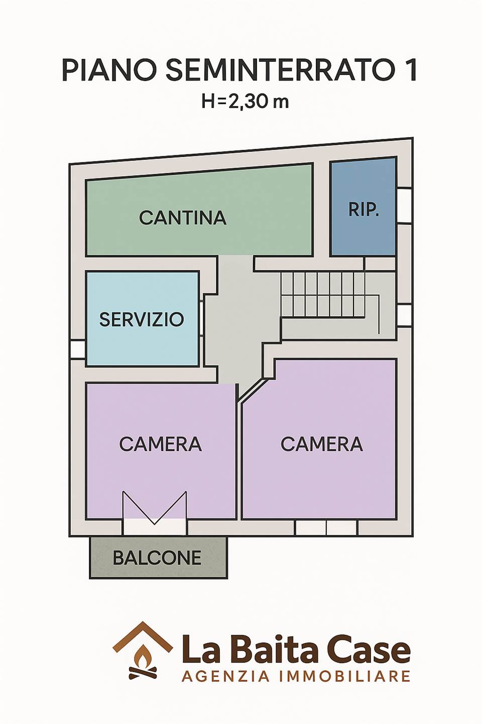 Piano semi interrato 1: due camere matrimoniali, bagno, ripostiglio C.T. e cantina;