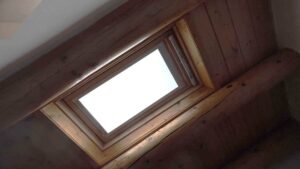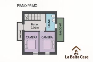 - piano primo: zona notte composta da due camere matrimoniali, entrambe con balcone panoramico e travi in legno a vista, e un bagno con doccia;