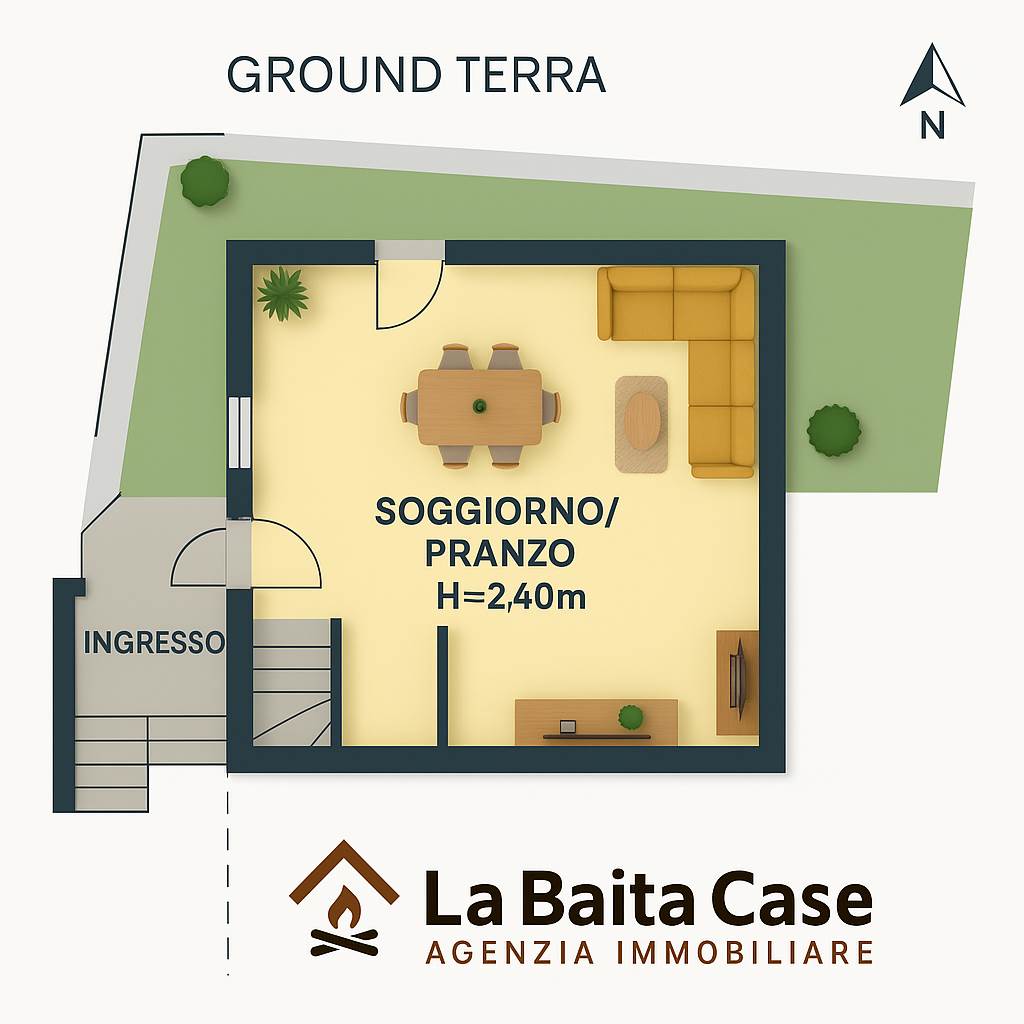 - piano terra: ampia zona giorno con cucina in legno su misura, soggiorno con camino a legna e accesso diretto al giardino pianeggiante, ideale per pranzi all'aperto, relax e momenti conviviali;