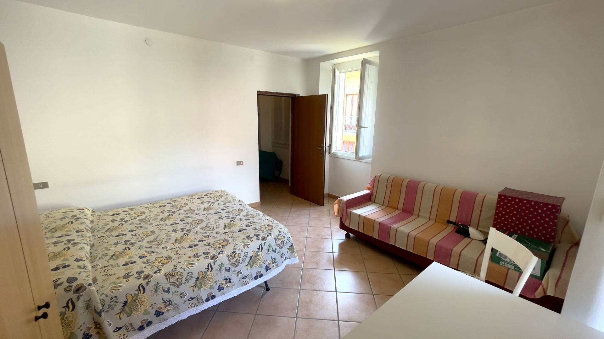 Secondo piano: seconda camera matrimoniale con accesso a un vano ripostiglio, attualmente utilizzato come cameretta singola. Non saranno ceduti con l’immobile: la cassettiera bianca della cameretta e il mobile marrone presente sulle scale.