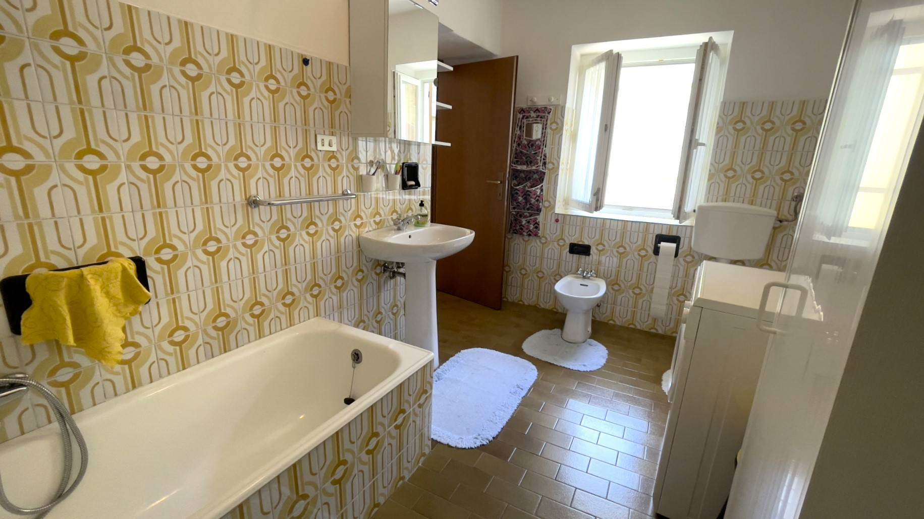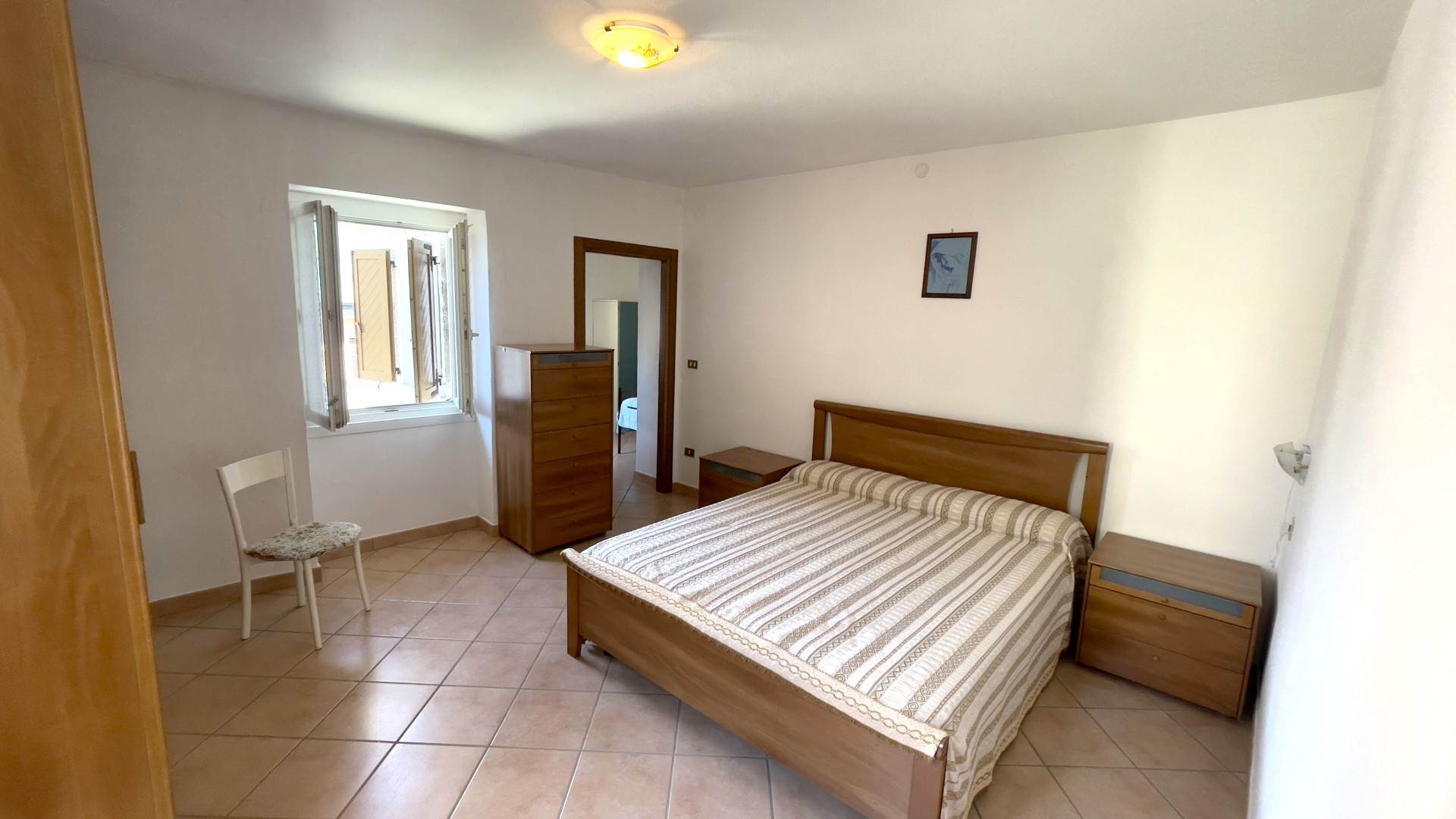Primo piano: camera matrimoniale arredata, bagno finestrato completo di vasca e lavatrice, oltre a un piccolo terrazzo panoramico con vista sulle montagne circostanti. La cassettiera bianca, l’armadio a due ante e il mobiletto alto del bagno verranno portati via e, pertanto, non saranno ceduti con l’immobile.