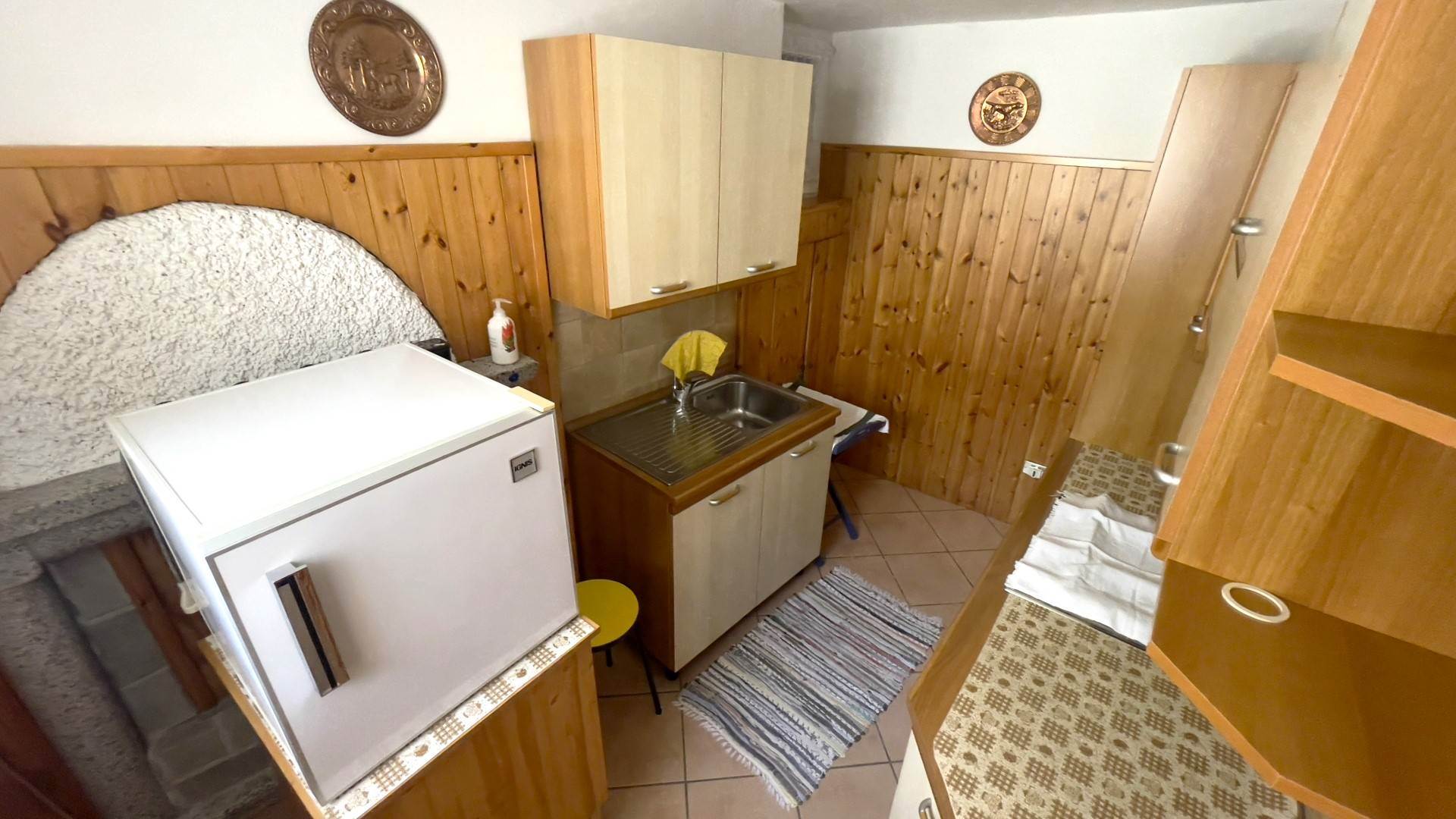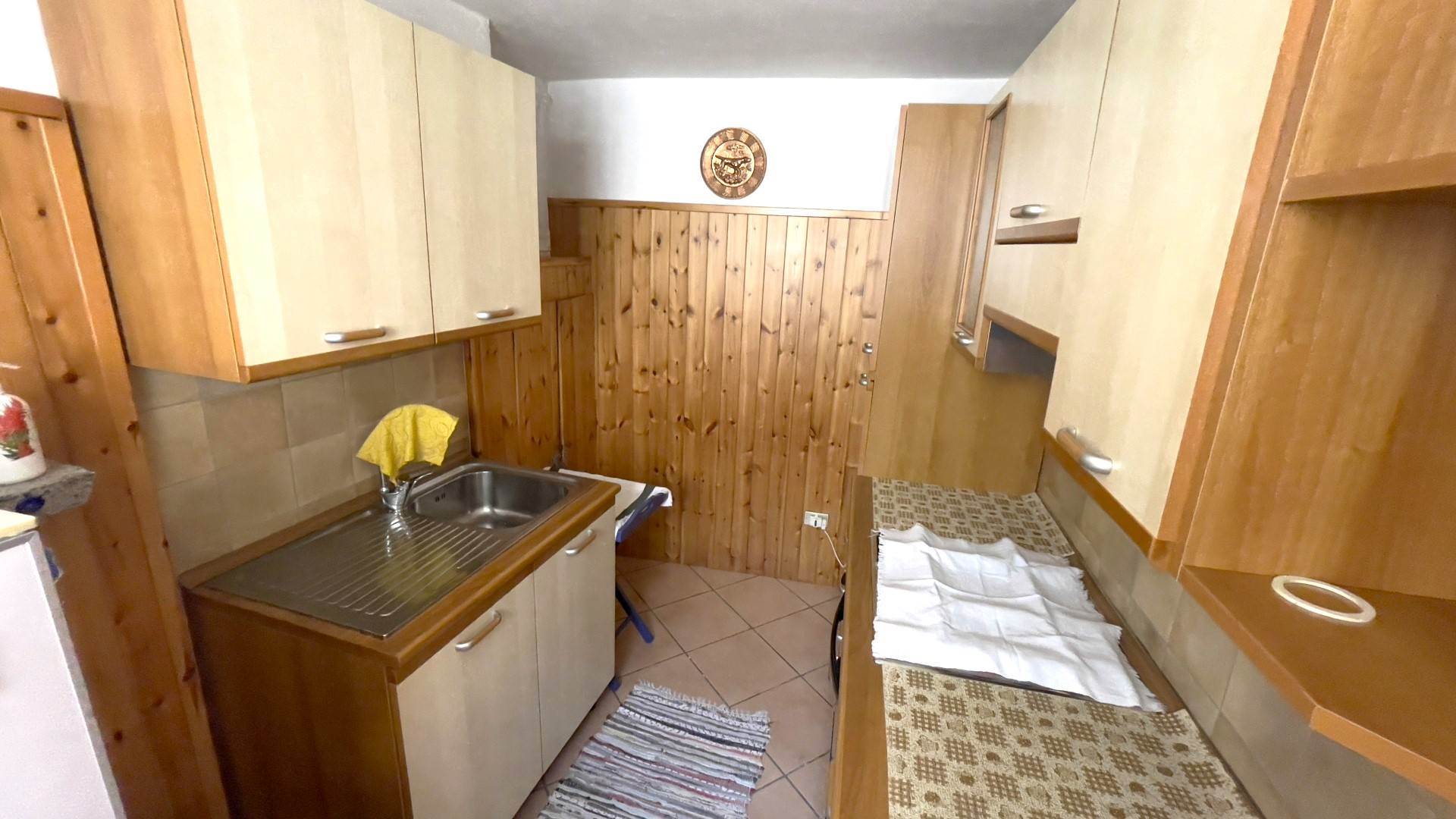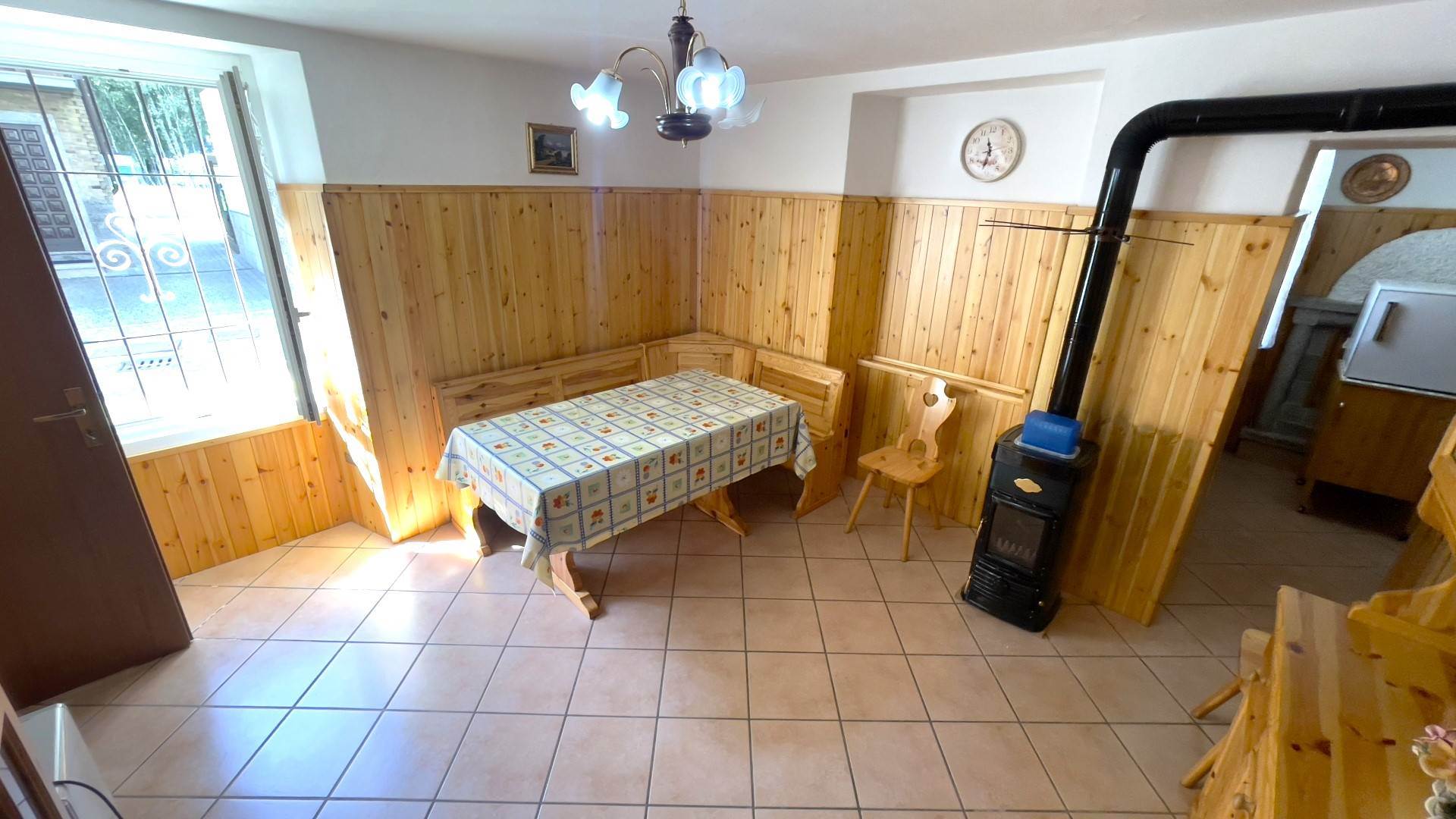 Piano terra: accogliente zona giorno con soggiorno-cucina, caratterizzata da rivestimenti in legno in tipico stile montano e riscaldata da una stufa a legna. Dal vano cottura si accede anche all’esterno. Si precisa che i proprietari non lasceranno la televisione né il deumidificatore.