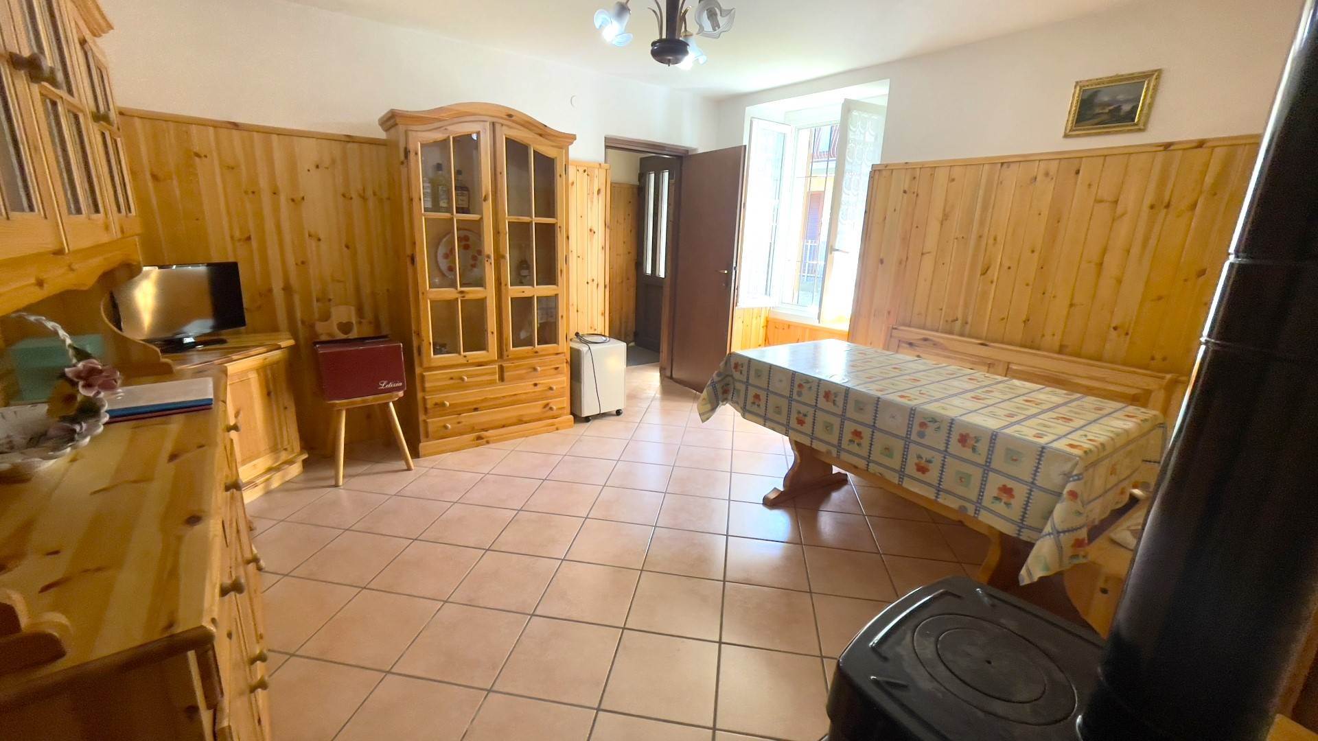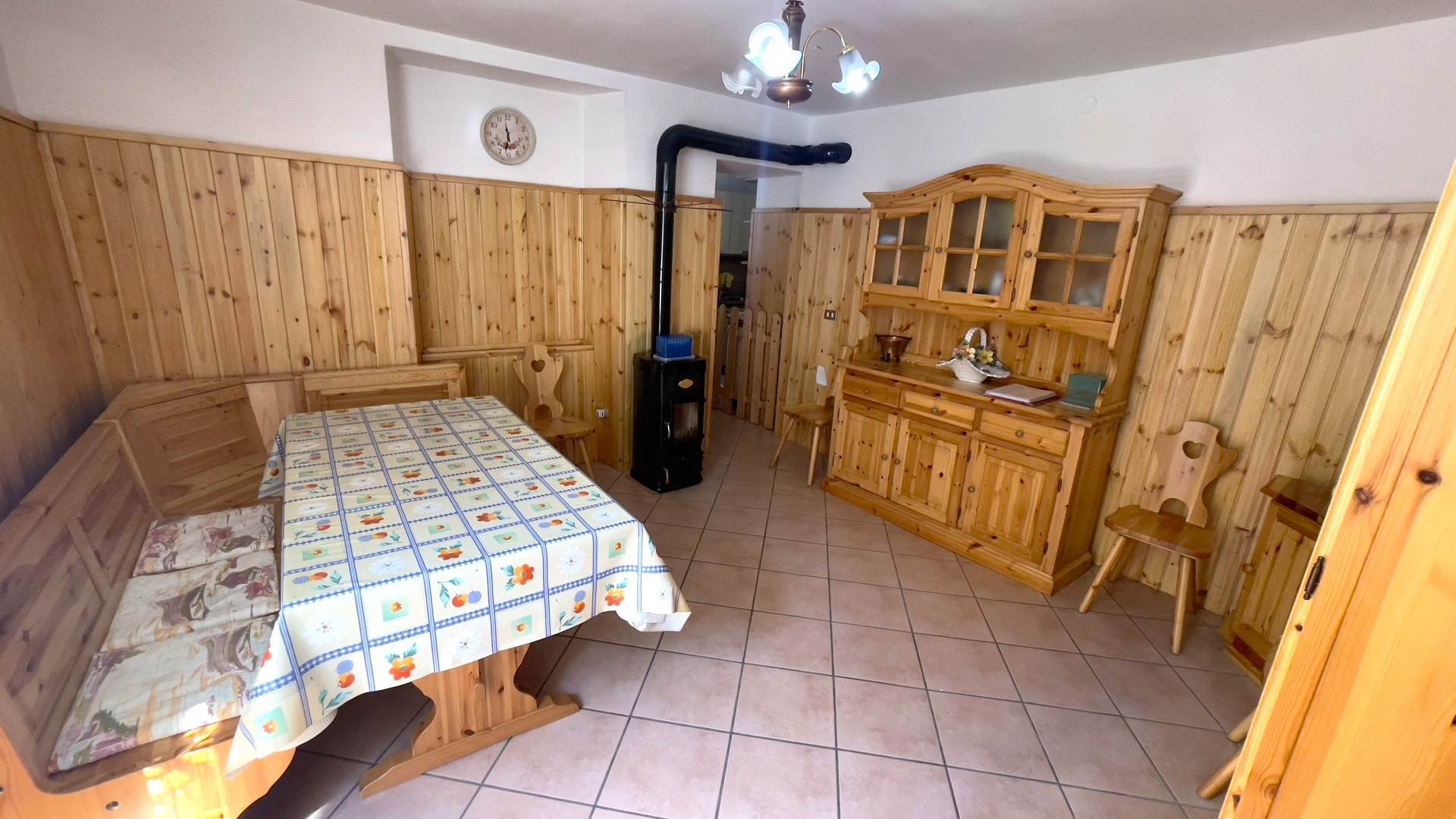 Piano terra: accogliente zona giorno con soggiorno-cucina, caratterizzata da rivestimenti in legno in tipico stile montano e riscaldata da una stufa a legna. Dal vano cottura si accede anche all'esterno. Si precisa che i proprietari non lasceranno la televisione né il deumidificatore.