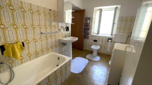 Primo piano: camera matrimoniale arredata, bagno finestrato completo di vasca e lavatrice, oltre a un piccolo terrazzo panoramico con vista sulle montagne circostanti. La cassettiera bianca, l'armadio a due ante e il mobiletto alto del bagno verranno portati via e, pertanto, non saranno ceduti con l'immobile.
