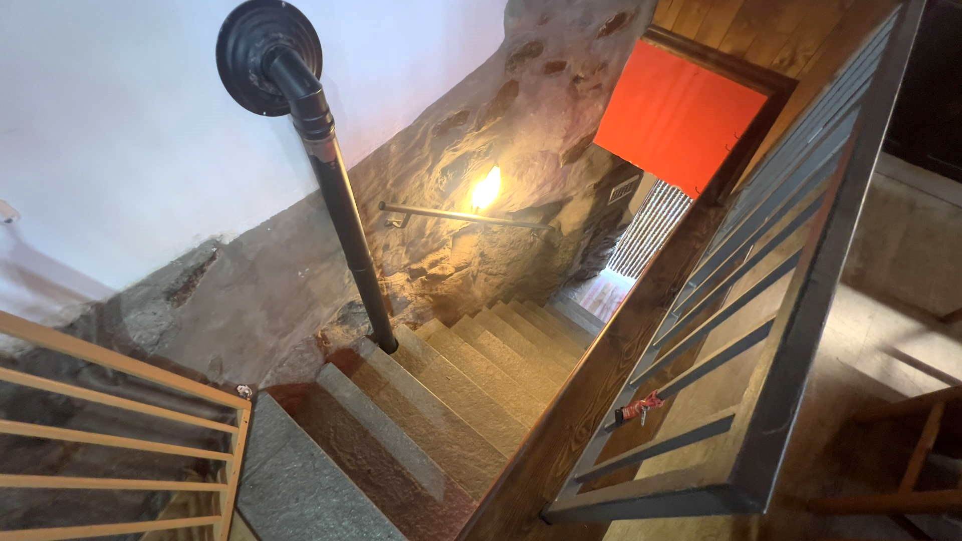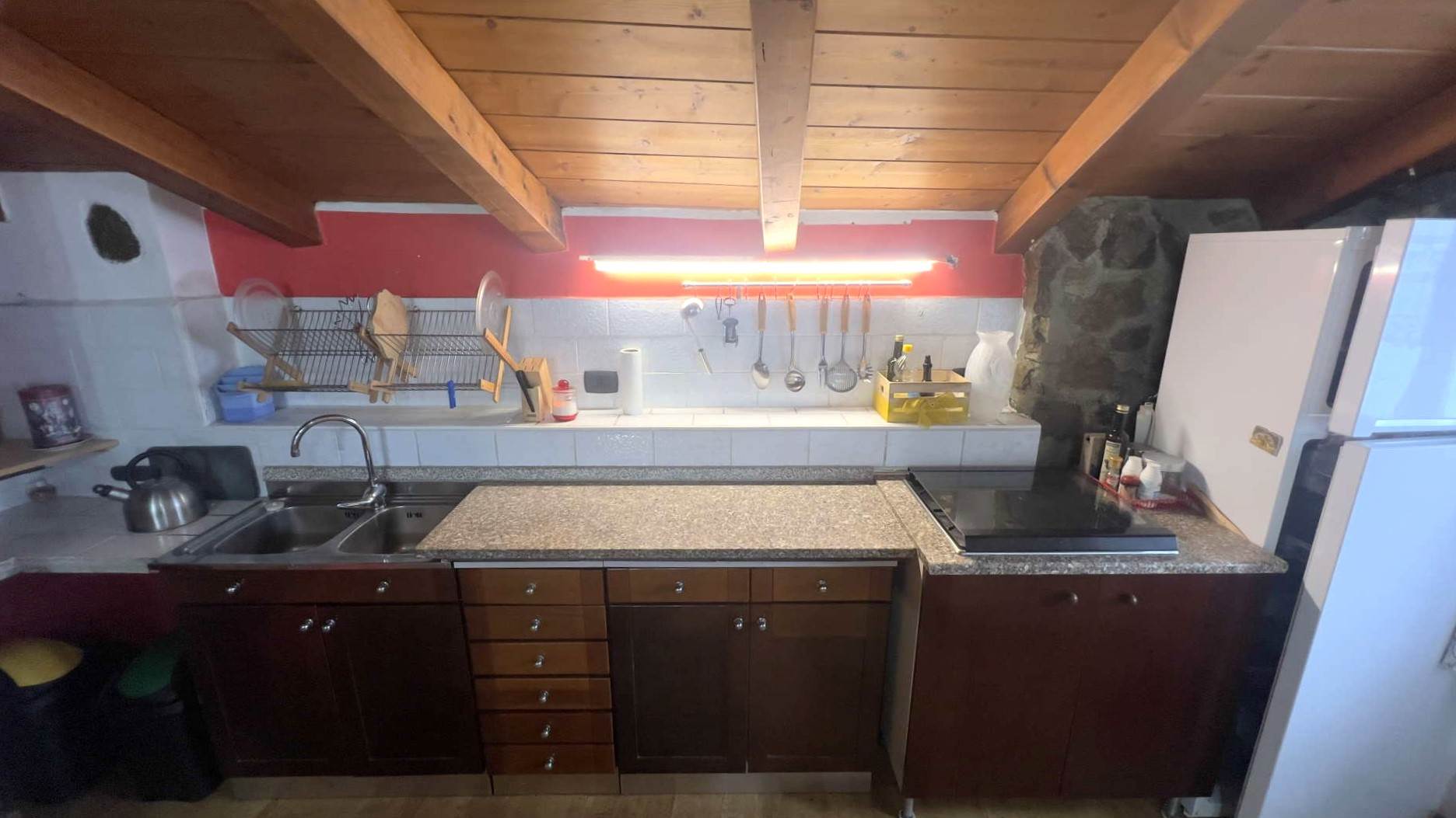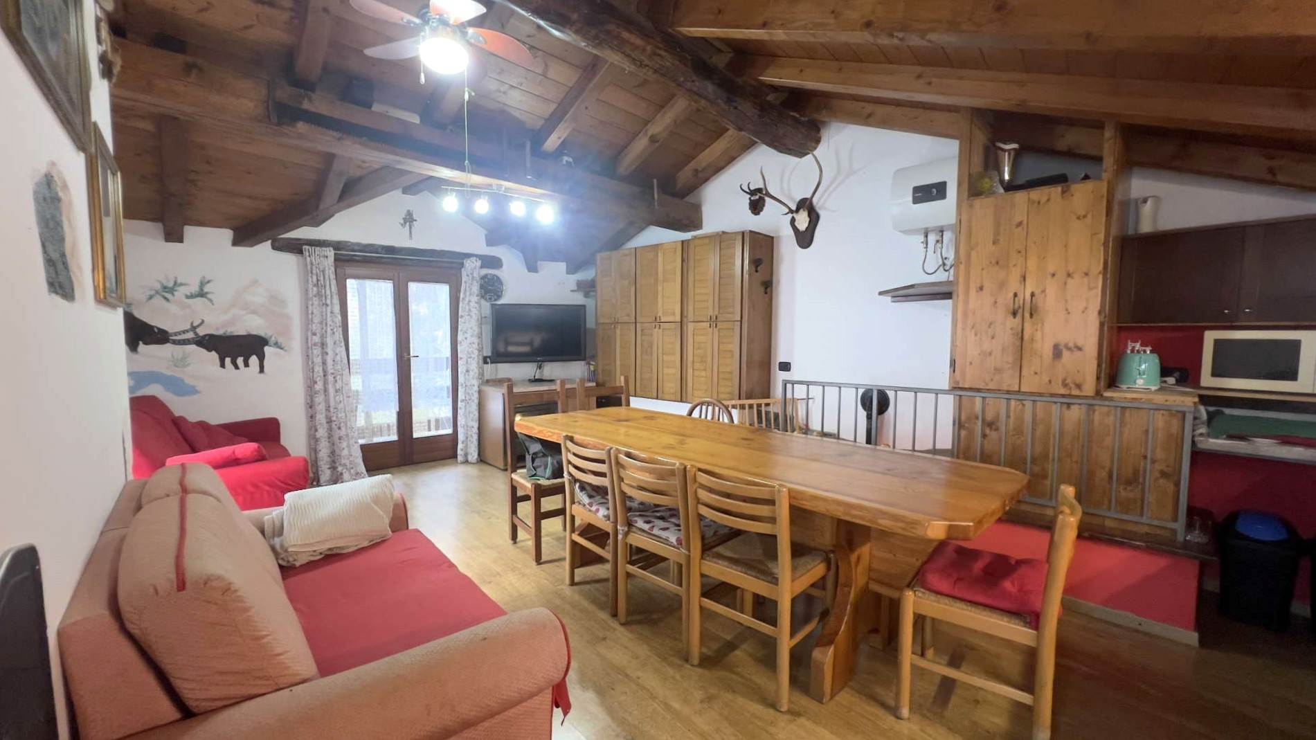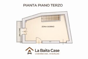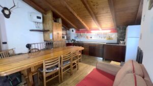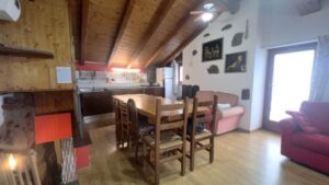 • Piano terzo (zona giorno): soggiorno con cucina a vista e ampio balcone a L, dal quale si gode di una piacevole vista panoramica sulla valle e dove è possibile pranzarci.Il riscaldamento è affidato a stufa a pellet, soluzione efficiente e in perfetta armonia con l'ambiente montano.