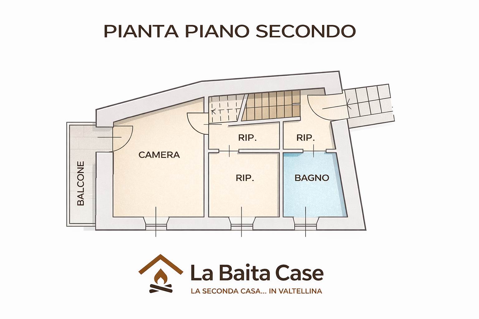 • Piano secondo (zona notte): due camere da letto, bagno e balcone.